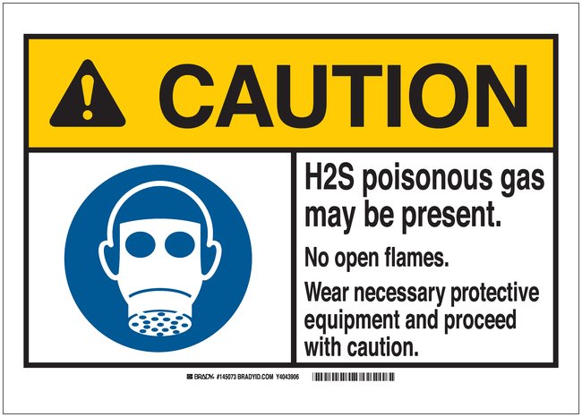 Signs: CAUTION: H2S POISONOUS GAS MAY BE PRESENT NO OPEN FLAMES WEAR NECESSARY PROTECTIVE EQUIPMENT AND PROCEED WITH CAUTION, Each