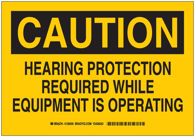 CAUTION: HEARING PROTECTION REQUIRED WHILE EQUIPMENT IS OPERATING signs remind employees about areas that require ear protection.