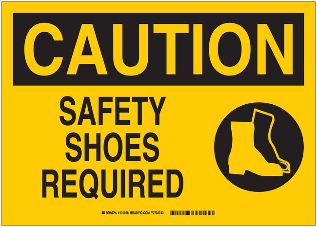Signs: CAUTION: SAFETY SHOES REQUIRED (W/PICTO), CAUTION: SAFETY SHOES REQUIRED (with PICTOGRAM) signs remind employees about areas that require shoes, Each