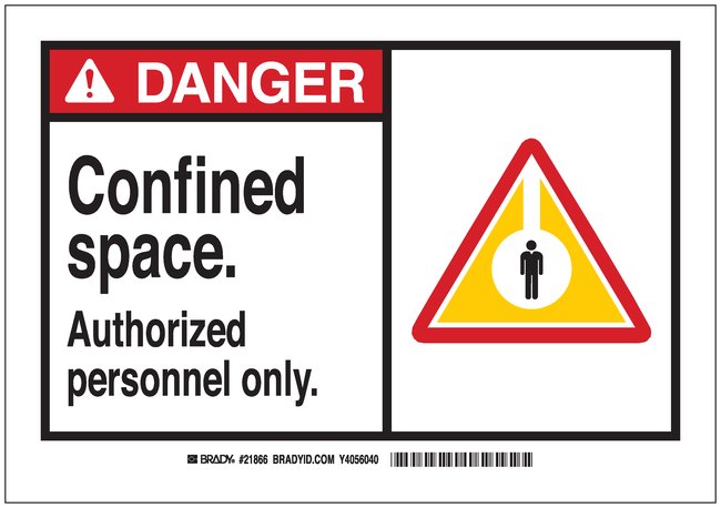DANGER: CONFINED SPACE—AUTHORIZED PERSONNEL ONLY (with PICTOGRAM) signs identify areas that require authorized or permit entry only.