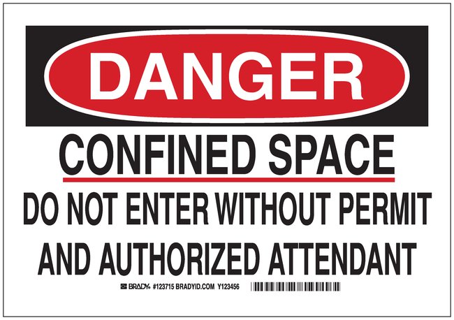 DANGER: CONFINED SPACE—DO NOT ENTER WITHOUT PERMIT AND AUTHORIZED ATTENDANT signs identify areas that require authorized or permit entry only.
