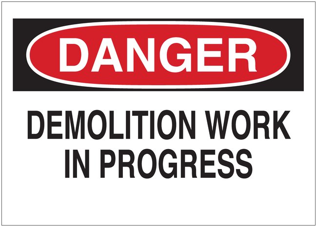 Signs: DANGER: DEMOLITION WORK IN PROGRESS, DANGER: DEMOLITION WORK IN PROGRESS signs reinforce proper operational procedures, Each