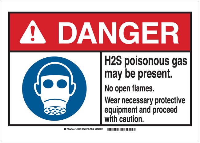 Signs: DANGER: H2S POISONOUS GAS MAY BE PRESENT NO OPEN FLAMES WEAR NECESSARY PROTECTIVE EQUIPMENT AND PROCEED WITH CAUTION, Each