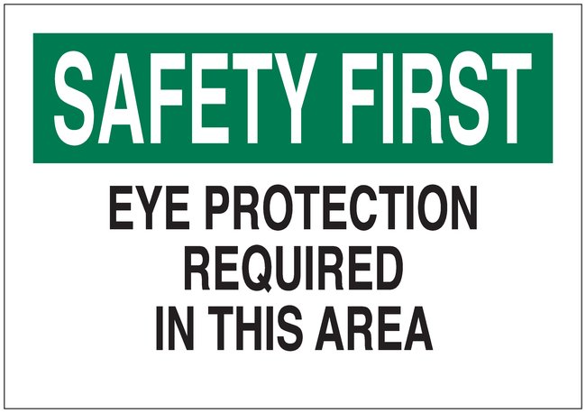 SAFETY FIRST: EYE PROTECTION REQUIRED IN THIS AREA signs remind employees about areas that require eye protection.