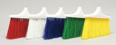 Angled Upright Brooms^ White, flagged polypropylene fibers are angled for uniform surface contact. Broom is ideal for sweeping very fine and medium particles on any surface. Handle/head connection system eliminates premature fiber fallout. Excellent chemical resistance. Handle sold separately.