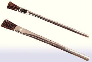 AB Series Acid Brushes^ Brushes are ideal for applying acid, glue, or coatings. #1 Horsehair bristle. Disposable. Rolled tin handle. Bristle length: 1.9cm. Overall length: 15.2cm.