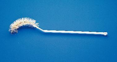 Volumetric Flask Brush^ White natural bristles mounted on a durable, plastic handle. Flexible, curved brush adapts to the shape of flasks. Brush diameter: 3.8cm. Brush head length: 10cm. Total length: 36cm.