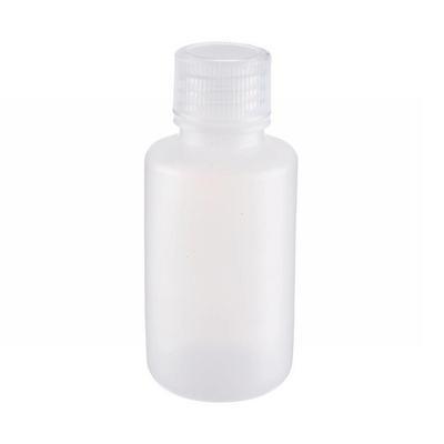 Leak-Resistant Bottle, LDPE, Narrow Mouth, with Cap Attached, 60mL^ Screw cap size: 20-410. Lightweight bottle is ideal for general laboratory use. Designed with a special pour lip to facilitate safe dispensing and prevent sample from running down the outside of the container. Leak-resistant.