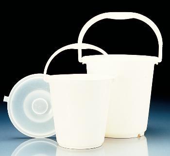 High-Density Polyethylene (HDPE) Bucket^ Features a hinged handle and graduation markings. Volume: 5L. Dimensions: 25dia.x24Hcm.