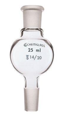 DISTILLING BULB, KUGELROHR^ Bulb: 10ml. Bulb Diameter: 30mm; Bulb Height: 85mm. Kugelrohr bulbs having 14/20 standard taper joints on both ends to connect to other bulbs or single neck round bottom flasks. CG-1012-14 adapter permits connection Kugelrohr assembly to vacuum.