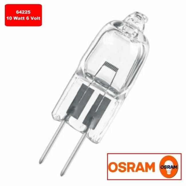 Micro Bulb; Osram-Sylvania; 6V, 10W; Lumens 200; Base G4; Shape T3; Overall length 31mm; Life Hours 100; Color Clear; 1/EA