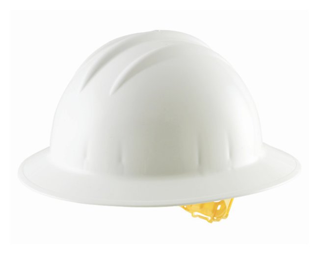 Hard hat equipped with a wide-profile shell that offers additional protection from sun, glare, and splashes in industrial applications.