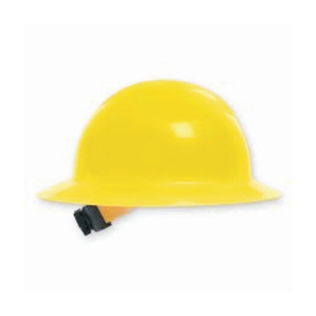 Hard hat equipped with a wide-profile shell that offers additional protection from sun, glare, and splashes in industrial applications.