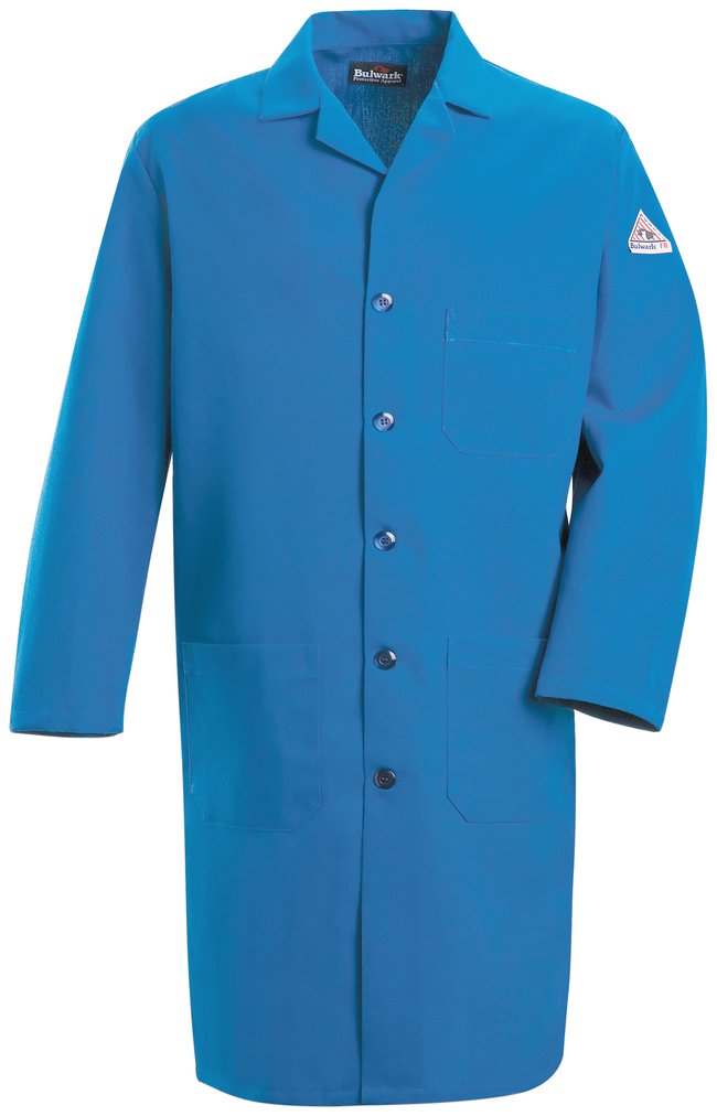 Arc Rating: ATPV 5.6 calories/cm2Button front closureLapel collarLeft chest pocketHemmed sleeve endsSide vent openingsRoyal blueHazard rating class 1