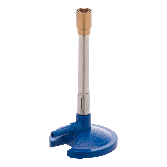 Quality gas burner for lab. use, aluminum burner mixing tube comes complete with a brass flame stabilizer. Mounted on a die casted zinc alloy base. Quality gas burner for lab. use, aluminum burner mixing tube comes complete with a brass flame stabilizer and is threaded into a die casted zinc alloy base. Equipped with a serrated inlet for connection to 6 - 8 mm tubing, air supply is controlled by a nickel plated brass sleeve covering ports at the lower end of the mixing tube. The brass orifice is fixed. Base dia 80 mm. Burner Specifications: Tube Dia. - 13 mm, Height - 160 mm, Weight - 120 g.