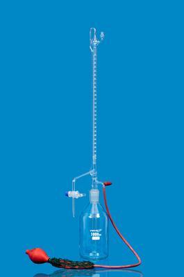 Burette Automatic^ Made From Borosilicate Glass, Buret Assembly With Precision Grade White Scale, Class A, Sub Division 0. 10Ml, Glass Stopcock, Capacity: 25Ml, Reservoir Bottle 1000Ml, Joint 24/20, With Rubber Bellow.