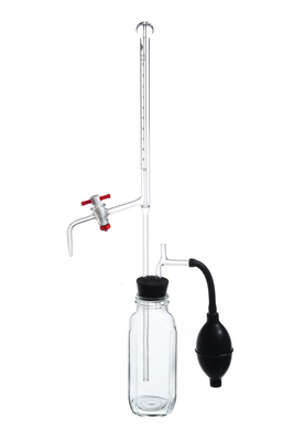 Buret, Laboratory Grade, Automatic, with Straight PTFE Stopcock, Complete^ Buret Capacity: 10mL; Subdivision: 0.1mL; Reservoir Capacity: 16 ounces; Stopcock Size: 2mm. Buret is filled by pressure supplied by the rubber bulb. Excess titrant is return to the reservoir.