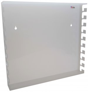 Wall mounted polypropylene burette rack safely organizes up to 10 glass or plastic burettes depending on length. Mounting screws not included.