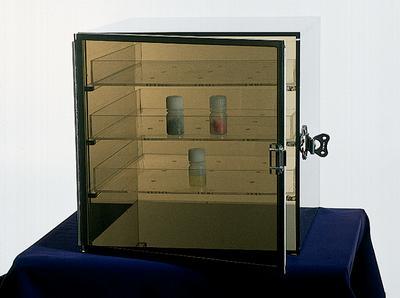 Acrylic Desiccator Cabinets^ Designed to provide low humidity and particulate-free storage on the bench top or in refrigerator or freezers. Perforated slide-in trays for easy sample removal. Dark bronze for light-sensitive materials. 30.84 L x 30.84 W x 30.84cm H (12x12x12in). 3 trays.