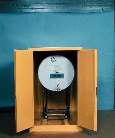 Vertical Drum Safety Storage Cabinet^ 208L drum capacity. 2 self-closing doors, 18-gauge double-wall steel, 3.8cm between walls, 3-point key lock, 151kg, and 2 vents with 5cm pipe thread fittings. 165.1Hx79.3Wx79.3Dcm. Equipped with adjustable drum supports. Meets OSHA, NFPA 30 standards.