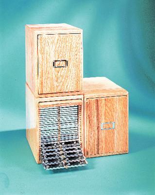 Micro Slide Storage Cabinet, Wood^ Seasoned oak construction. Stackable. Contains 25 lightweight, sturdy aluminum trays with 20 individual compartments for laying slides flat. Each compartment accommodates two 75x25mm slides. Trays are numbered to aid in identification. 21Wx33Dx28Hcm.