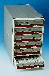 Tissue-Tek* Embedding Ring Filing Cabinet^ Stackable cabinets accommodate 1000 rings. One-piece construction eliminates hinges and doors for dust-free storage. Includes six, impact-resistant drawers, each with an identification area. Dimensions: 43x24x38cm.