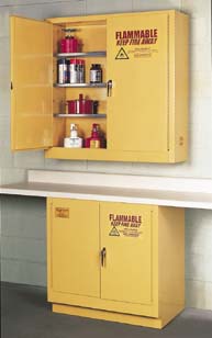 Under-Counter Cabinet^ With manual close doors. Weight: 102kg. Dimensions: 88.9Wx55.9Dx88.9Hcm. Capacity: 83.3L. For flammable liquids. Double-walled 18-gauge steel construction. Includes 1 shelf, grounding attachments, 5cm raised leakproof door sills. Conforms to OSHA, NFPA specifications.