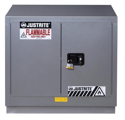 Safety Cabinets,OSHA compliant, FM Approved Sure-Grip*EX fire resistant^ provide extra safe and secure storage for flammable liquids. Exclusive features include padlockable U-Loc* handle, SpillSlope* safety shelves, and a 3-point stainless steel bullet latching system.