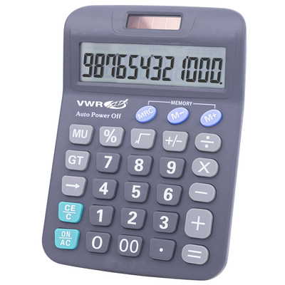 Here is the corrected text: Calculators feature arithmetic functions (add, subtract, multiply, and divide), percent, three-key memory, and a floating decimal point. The calculator with an 8-digit display also has a square root function. This solar-powered unit can be read in any light and perform chain calculations. Its large display with 1.9 cm (3/4") high digits is angled to eliminate reflected glare. The tough ABS plastic case is ideal for rough lab use, and its feet protect the unit from spills. Instructions are included. Calculators are available with either an 8-digit or a 12-digit display. Oversized keys • Large digits • Tough ABS plastic case