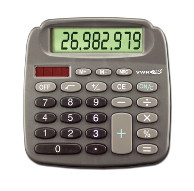 Here is the corrected text: Calculators feature arithmetic functions such as addition, subtraction, multiplication, and division, as well as percentage calculations, three-key memory, and floating decimal points. The calculator with an 8-digit display also includes a square root function. This solar-powered unit can be read in any lighting condition and perform chain calculations. The large display features 1.9 cm (3/4") high digits that are angled to eliminate reflected glare. The tough ABS plastic case is ideal for rough laboratory use, and the feet on the bottom protect the unit from spills. Instructions are included. Calculators are available with either an 8-digit or 12-digit display. Oversized keys Large digits Tough ABS plastic case VWR Calculator with 12-digit display, Cat. No.: 46610-052 VWR Calculator with 8-digit display, Cat. No.: 23609-236