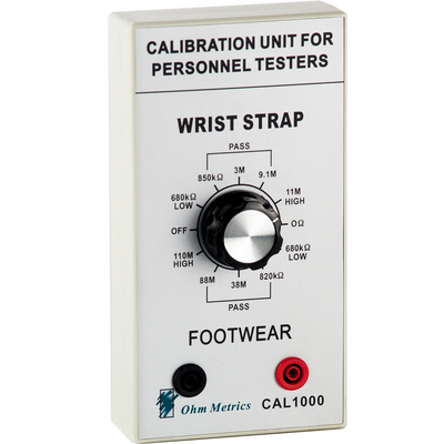 Calibration Unit^ Calibration Unit, Tester Calibration Device, ESD, ohm Metrics CAL 1000, Accuracy: /- 3%, Dimensions: 7in x 3.7inx 1.3in, Passive. No power source required, Wrist strap test range: 750 kil ohm - 10 meg ohm, Footwear test range: 750 kil ohm - 100 meg ohm, NIST traceable