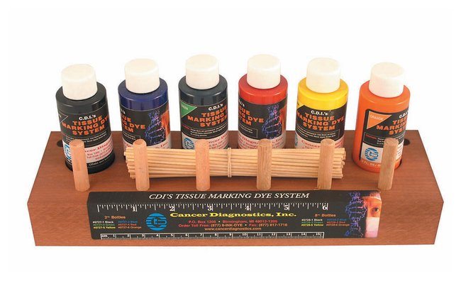 Dyes are pigment-based with an alcohol foundation for consistency and durabilityProprietary blend of materials remains bright through processing and produces clean, crisp resultsWill not run or bleed on tissueImpervious to laboratory chemicals and reagentsOrder InfoIndividual colors available in two sizes; also available in systems with sets of six or seven colors, wood tray and 50 applicator sticks. Two-year shelf life.