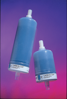Disposable Filter Devices, Carbon Cap 75^ Media:Activated Carbon/HEPA Cartridge. Mesh Size:12 x 20. Area Equivalent:26,000 m2. Retention (HEPA):99.97% at 0.3 um. Carbon Cap is a disposable filter device containing a high purity, high purity, high efficiency, acid washed, granular activated carbon.