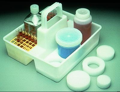 Laboratory Carrier, HDPE, non sterile^ Reduces breakage and spillage when transporting glass and plastic bottles. Two foam inserts with six holes (consisting of removable circular sleeves) keep bottles separated. Remove concentric foam sleeves to accommodate up to six bottles with 2-3/8-in.