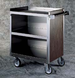 Three-Sided Stainless Steel Cart^ Three stainless steel shelves measure 39x61cm. Top shelf has a 2.5cm lip on three sides. Bumpers on legs and handle. 8.9cm swivel rubber casters. Capacity: 91kg. Assembled. Overall size: 42Wx70Lx83Hcm. Shipping weight: 18.2kg.