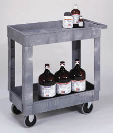 Heavy-Duty Utility Cart^ Two shelves. Beige. Ideal for cleanroom use. Molded plastic. Seamless, easy to clean. No sharp edges to scratch walls. Integral handle, non-marking casters. 45.7Wx99.1Lx83.8Hcm. Nominal load capacity: 226.8kg. Shipping weight: 14.1kg. USDA listed.