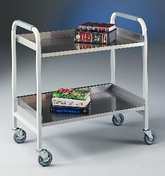 Stainless Steel Cart^ Holds up to 181kg. Two removable polished Type 304 stainless steel pans are 5cm deep on three sides and open on one side for easy transfer of equipment. Frame is 2.5cm square steel tubing. Four 10.2cm diameter casters. Shipped assembled. 96Wx48Dx92Hcm. Shipping weight: 25.5kg.