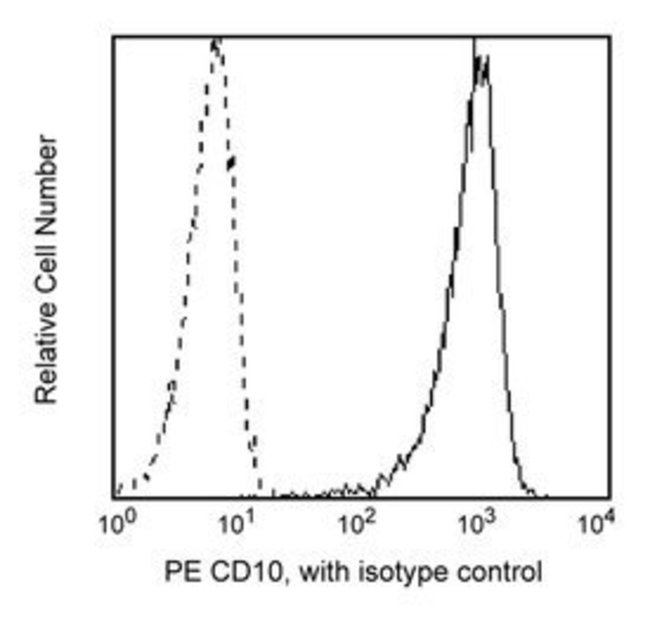 Clone HI10a reacts with the human form of the 100kDa type II transmembrane glycoprotein, also known as the common acute lymphoblasticleukemia antigen (CALLA). CD10 is expressed on granulocytes, a subset of B-cell progenitors, germinal center cells and fibroblasts. Clone HI10a also cross-reacts with a subset of peripheral blood granulocytes of baboon, and both rhesus and cynomolgus macaque monkeys. The reactivity pattern on granulocytes is similar to that observed with peripheral blood granulocytes from normal human donors.