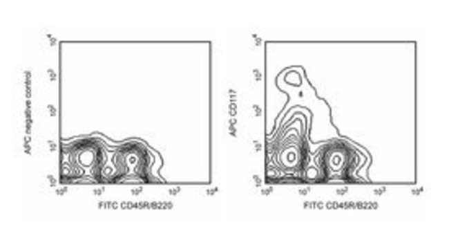 The 2B8 monoclonal antibody specifically binds to CD117 (c-Kit), a transmembrane tyrosine-kinase receptor that is encoded by the Kit gene (formerly dominant white spotting, W ). The c-Kit ligand (also known as steel factor, stem cell factor, and mast cell growth factor) encoded by the Kit1 gene (formerly steel, SI), is a co-mitogen for hematopoietic stem cells, myeloerythroid progenitors and a mast-cell differentiation factor. The KitW and Kit1SI mutant alleles have similar pleiotropic effects on the development of melanocytes, germ cells, and the hematopoietic system. In the adult bone marrow, CD117 is expressed on hematopoietic progenitor cells, including CD90 (Thy-1) low, TER-119-, CD45R/B220-, CD11b (Mac-1)-, Ly-6G (Gr-1)-, CD4-, CD8-, and Sca-1 (Ly-6A/E)+ multipotent hemotopoietic stem cells, progenitors committed to myeliod and/or erythroid lineages, and precursors of B and T lymphocytes. This widespread expression of CD117 in hematopoietic precursors is consistent with the participation of c-Kit and its ligand in the regulation of several hematopoietic lineages. Intrathymic expression of c-Kit and c-Kit ligand suggest that CD117 is also involved in the regulation of some events during the development of T lymphocytes. CD117 is also expressed by mast cells and by dendritic cells found in the periarteriolar lymphocytoc sheaths (T-cell areas) of splenic white pulp. The mAb 2B8 reportedly does not block the action of c-Kit. This clone 2B8 had been reported that there was cross-reactivity with rat.