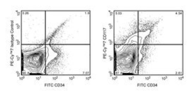 The 2B8 antibody reacts with CD117 (c-Kit), a transmembrane tyrosine-kinase receptor which is encoded by the Kit gene (formerly dominant white spotting, W). The c-Kit ligand (also known as steel factor, stem cell factor, and mast cell growth factor) encoded by the Kit1 gene (formerly steel, SI), is a co-mitogen for hematopoietic stem cells, myeloerythroid progenitors and a mast-cell differentiation factor. The KitW and Kit1SI mutant alleles have similar pleiotropic effects on the development of melanocytes, germ cells, and the hematopoietic system. In the adult bone marrow, CD117 is expressed on hematopoietic progenitor cells, including CD90 (Thy-1) low, TER-119-, CD45R/B220-, CD11b (Mac-1)-, Ly-6G (Gr-1)-, CD4-, CD8-, and Sca-1 (Ly-6A/E)+ multipotent hemotopoietic stem cells, progenitors committed to myeliod and/or erythroid lineages, and precursors of B and T lymphocytes. This widespread expression of CD117 in hematopoietic precursors is consistent with the participation of c-Kit and its ligand in the regulation of several hematopoietic lineages. Intrathymic expression of c-Kit and c-Kit ligand suggest that CD117 is also involved in the regulation of some events during the development of T lymphocytes. CD117 is also expressed by mast cells and by dendritic cells found in the periarteriolar lymphocytoc sheaths (T-cell areas) of splenic white pulp. The mAb 2B8 reportedly does not block the action of c-Kit. This clone 2B8 had been reported that there was cross-reactivity with rat.Host Species: RatClone: 2B8Isotype: IgG2b κSpecies Reactivity: MouseImmunogen: Mouse Bone Marrow Mast CellsFlow Cytometry
