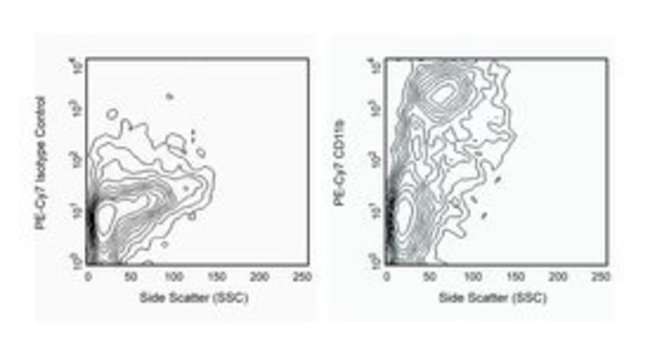 The M1/70 antibody reacts with the 170kDa α[M] chain of Mac-1 (CD11b/CD18, α[M]β[2] integrin), also known as complement receptor 3 (CR3), which mediates adhesion to C3bi and ICAM-1 (CD54). Mac-1 is expressed at varying levels on granulocytes, macrophages, myeloid-derived dendritic cells, natural killer cells, microglia, and B-1 cells. Mac-1 expression is rapidly up-regulated on neutrophils after activation, in the same time period that CD62L (L-selectin) is shed from the cell surface. M1/70 antibody reportedly blocks cell adherence and C3bi binding, but it does not block cell-mediated lysis. Cross-reaction of mAb M1/70 with CD11b on human monocytes, polymorphonuclear leukocytes, and NK cells has been reported. This antibody is routinely tested by flow cytometric analysis. Other applications were tested at BD Biosciences Pharmingen during antibody development only or reported in the literature.Host Species: RatClone: M1/70Isotype: IgG2b κSpecies Reactivity: MouseImmunogen: Mouse splenic CellsFlow Cytometry