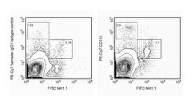 The HL3 antibody reacts with the integrin αx chain of gp150, 95 (CD11c/CD18) which is expressed on dendritic cells and CD4- CD8+ intestinal intraepithelial lymphocytes (IEL) and is upregulated on IEL and lymph-node T cells following in vivo activation. CD11c is also found on human NK cells. Although its expression on mouse NK cells is not published, we have detected CD11c on mouse splenic NK cells. Cells of the monocyte/macrophage lineage have been reported to express low levels of CD11c. CD11c plays a role in binding of iC3b.Host Species: HamsterClone: HL3Isotype: IgG1, <special id='310'/>2Species Reactivity: MouseImmunogen: C57BL/6 Mouse Intestinal Intraepithelial LymphocytesFlow Cytometry