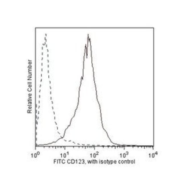 Reacts with human CD123, the 70kDa IL-3 receptor α chain (IL-3Rα), which associates with the 120-140kDa β subunit. The β chain is shared with the receptors for interleukins IL-5 and GM-CSF. IL-3Rα is expressed on hematopoietic progenitors and plays an important role in hematopoietic progenitor cell growth and differentiation. This antibody has been reported to block the binding of 125I-IL-3 to high and low affinity IL-3 receptors. In functional experiments, this antibody was found to inhibit acute myeloid leukemia cell proliferation, basophil histamine release, endothelial cell-mediated IL-8 secretion, and neutrophil transmigration. This antibody has been reported to be useful for immunoprecipitation, western blot and immunofluorescent staining for flow cytometry. At the Fifth HLDA Workshop, the human IL-3 receptor was designated CD123.