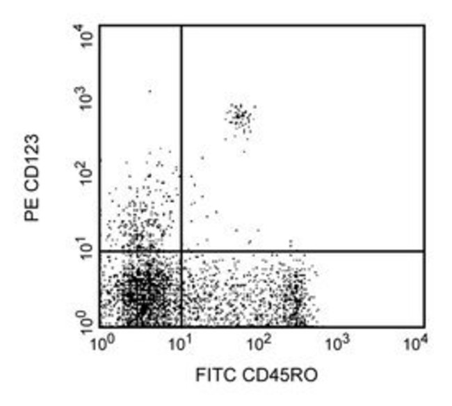 The 9F5 monoclonal antibody specifically binds to CD123. CD123 is the 70 kDa IL-3 receptor α chain (IL-3Rα) that associates with the 120-140 kDa β subunit (CD131/Common β-chain/βc) to form the functional IL-3 receptor complex. The βc chain is also shared with distinct α chain subunits to form the functional heterodimeric receptors for interleukins IL-5 and GM-CSF. IL-3Rα is expressed on a subset of peripheral blood dendritic cells, myeloid precursors, basophils, mast cells, macrophages, and megakaryocytes. Reports indicate that IL-3Rα is also expressed on lymphocytes. The IL-3R plays an important role in hematopoietic progenitor cell growth and differentiation. This antibody does not block binding of IL-3 to the IL-3 receptor.