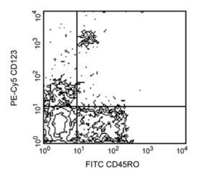 The 9F5 monoclonal antibody specifically binds to CD123. CD123 is the 70 kDa IL-3 receptor α; chain (IL-3Rα;) that associates with the 120-140 kDa β; subunit (CD131/Common β;-chain/β;c) to form the functional IL-3 receptor complex. The β;c chain is also shared with distinct α; chain subunits to form the functional heterodimeric receptors for interleukins IL-5 and GM-CSF. IL-3Rα; is expressed on a subset of peripheral blood dendritic cells, myeloid precursors, basophils, mast cells, macrophages, and megakaryocytes. Reports indicate that IL-3Rα; is also expressed on lymphocytes. The IL-3R plays an important role in hematopoietic progenitor cell growth and differentiation. This antibody does not block binding of IL-3 to the IL-3 receptor.