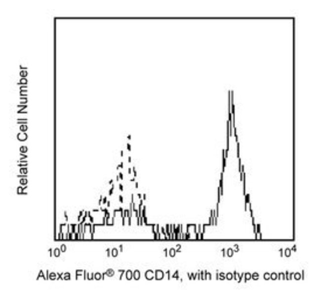 Reacts with the 53-55kDa glycosylphosphatidylinositol (GPI)-anchored single chain glycoprotein expressed at high levels on monocytes. Additionally, CD14 antibody reacts with interfollicular macrophages, reticular dendritic cells, and some Langerhans cells. CD14 has been identified as a high affinity cell-surface receptor for complexes of lipopolysaccharide (LPS) and serum LPS-binding protein, LPB.Host Species: MouseClone: M5E2Isotype: IgG2a, κCross Reactivity: Human, Rhesus, Cynomolgus, BaboonFlow Cytometry