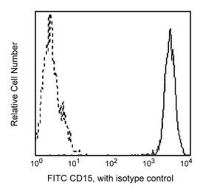 Reacts with 3-fucosyl-N-acetyllactosamine (3-FAL), a 220kDa carbohydrate structure, also called X-hapten, SSEA-1, CD15 or Lewis X. 3-FAL is expressed on >95% of granulocytes, including neutrophils and eosinophils, and to a varying degree on monocytes, but not on lymphocytes or basophils. CD15 plays a role in mediating phagocytosis, bactericidal activity and chemotaxis. This antibody is also suitable for staining formalin-fixed, paraffin-embedded tissue sections without pretreatment. Since the Abs are recognizing a carbohydrate epitope (3-fucosyl-N-acetyllactosamine) they also should work across species and not only for human.Flow Cytometry