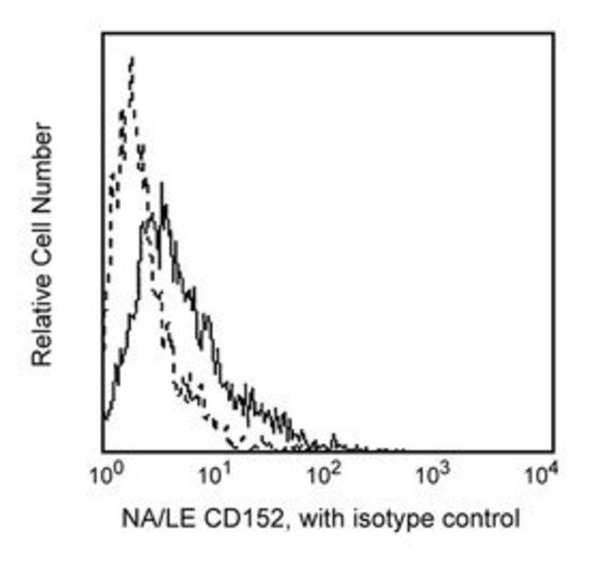 Reacts with the “cytolytic T lymphocyte-associated antigen”, CTLA-4. CTLA-4 is transiently expressed on activated CD28+ T cells and binds to CD80 and CD86 present on antigen presenting cells (APC) with high avidity. This interaction appears to deliver a negative regulatory signal to the T cell. There are recent reports that indicate that CTLA-4 is also expressed on B cells when cultured with activated T cells, suggesting a possible role of CTLA-4 in the regulation of B-cell response. Immobilized BNI3.1 enhances T-cell proliferation induced by CD3 and CD28. This antibody is routinely tested by flow cytometric analysis. Other applications were tested at BD Biosciences Pharmingen during antibody development only or reported in the literature.