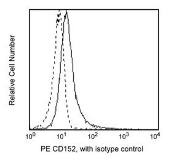 Reacts with the “cytolytic T lymphocyte-associated antigen”, CTLA-4. CTLA-4 is transiently expressed on activated CD28 T cells and binds to CD80 and CD86 present on antigen presenting cells (APC) with high avidity. This interaction appears to deliver a negative regulatory signal to the T cell. There are recent reports that indicate that CTLA-4 is also expressed on B cells when cultured with activated T cells, suggesting a possible role of CTLA-4 in the regulation of B-cell response. Immobilized BNI3.1 enhances T-cell proliferation induced by CD3 and CD28. Recent studies have showed that CD152 can be expressed by regulatory T (Treg) cells. It has been found this antibody can stain the intracellular CD152 on the Treg cells after fixation and permeabilization of cells. Clone BNI3 also cross-reacts with a subset of peripheral blood lymphocytes of baboon, and both rhesus and cynomolgus macaque monkeys, following Concanavalin A (Con A) treatment. The distribution of BNI3 cells following activation is similar to that observed with peripheral blood lymphocytes from normal human donors. This antibody is routinely tested by flow cytometric analysis. Other applications were tested at BD Biosciences Pharmingen during antibody development only or reported in the literature.