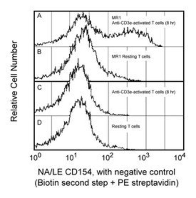 The MR1 antibody reacts with CD154 (CD40 Ligand, gp39), an accessory molecule expressed on activated T helper (CD4 ) lymphocytes. CD154 has also been detected on other types of leukocytes, including CD8 T cells, medullary thymocytes, activated CD4 NK-T cells, and human NK cells. CD154 plays an important role in costimulatory interactions between T and B lymphocytes and between antigen-presenting cells and lymphocytes, regulating the immune response at multiple levels. MR1 mAb inhibits in vitro activation of B lymphocytes by T helper cells by blocking interaction of gp39 with CD40. In vitro interactions of T cells and antigen-presenting cells can also be blocked by the MR1 antibody. In vivo treatment with MR1 antibody blocks the development of experimental autoimmune disease, inhibits formation of germinal centers and generation of memory B cells, reduces T-lymphocyte responses to allogeneic cells and allografts, prevents intrathymic deletion of self-reactive T lymphocytes, and disrupts antigen-specific T-cell responses.